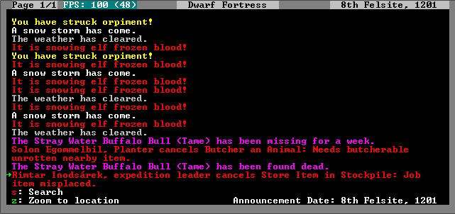 Before the end of the first month, a weight is lifted off my shoulders. The dwarves will still gain unhappy thoughts when caught in the freakish weather, but compared to some of the procedurally generated horrors I've dealt with in the past, elf blood blizzards look like a fluffy wambler infestation.