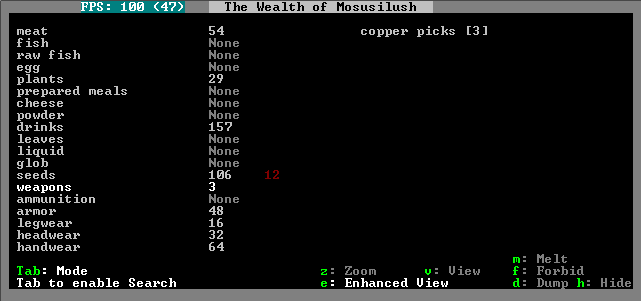 Additionally, the recent influx of migrants introduces another kind of danger - starvation. With only a farm plot to grow from, my dwarves are dependent upon mushrooms for food, and our reserves of prepared insect brains are running dangerously low. I have plenty of dogs (and puppies!), but these cannot be slaughtered, for fear that their skin will rise again, animated by the same foul forces that prevent a forge from being built in the first place.