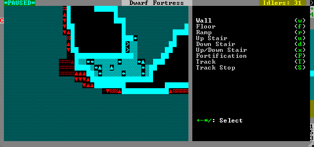 Once those walls have been constructed, the temporary floors are torn up, their bricks reclaimed. The bit of floor designated here has a pool of magma covering it - mercifully, no dwarf was standing there when it splashed onto the platform.
