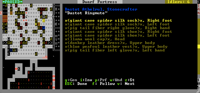 She is a dwarf particularly prone to unhappiness, it seems, and has recently experienced a number of unpleasantries. Some of these unhappy thoughts I could have prevented, but some are to be expected. Cave adaptation is to be expected, there's not much I can do about the weather. The monotony of food, however, might yet be handled with the butchering of a few choice canines (safe within the cage-trapped charnel chamber, of course), and I had simply forgotten to get the clothing industry up and running.