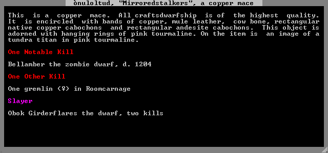 Obok Girderflares is certainly the finest warrior in the fortress - and also, the best equipped. In addition to a masterfully crafted suit of copper armor, Obok wears an exceptionally crafted adamantine helm, and bears two legendary artifacts.