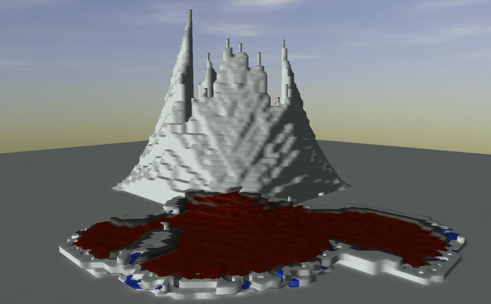 The obsidian structure seems to have had little effect upon the results of the weapon - most of the lava is flowing down the southern slope towards the very corner of the volcano.