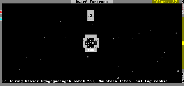It is the 22nd of Granite, in the early spring of 1211. Just over ten years have passed since the dwarves of the Momentous Dye first arrived at the Oily Furnace, the damned mountain of volcanic ice rising jagged above the haunted glacier known as the Ice of Ghosts. For an entire decade, Roomcarnage has endured, withstanding an unceasing barrage of unholy threats - armies of the walking dead, vampiric usurpers, forgotten beasts from the unknown depths, icy voids in the fabric of time and space. Now, the zombifying plague of foul fog has created a new monstrosity for the fortress to face: a mountain titan foul fog zombie, a horrific abortion of natural law, an immortal shelled dinosaur with no eyes and a poisonous bite, empowered by an undead disease that renders it immune to pain and most forms of physical damage.