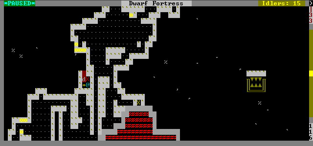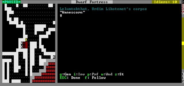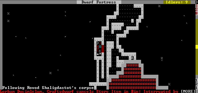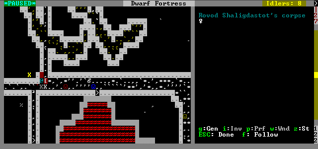 The corpse dives down the stairwell - down, past the militia, past the barracks and the forge and the lava lake, into the deepest mines of the fortress. The walls of the claustrophobic passage run red with blood before the corpse is slain.