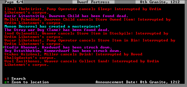 My prayers go unanswered. The announcement screen is inundated with cancellations brought on by undead. Two more dwarves have been struck down. Death has come to Roomcarnage.