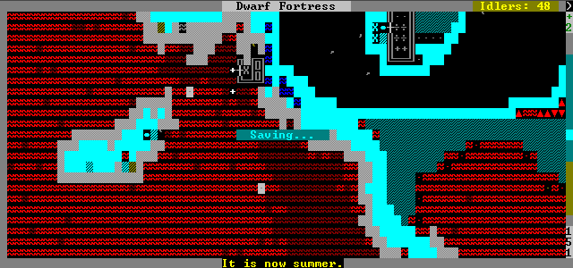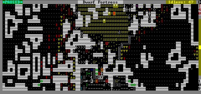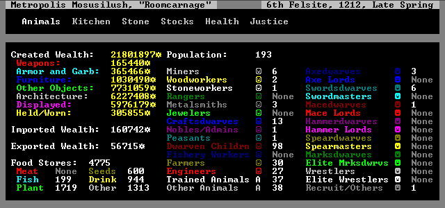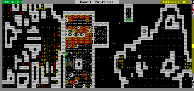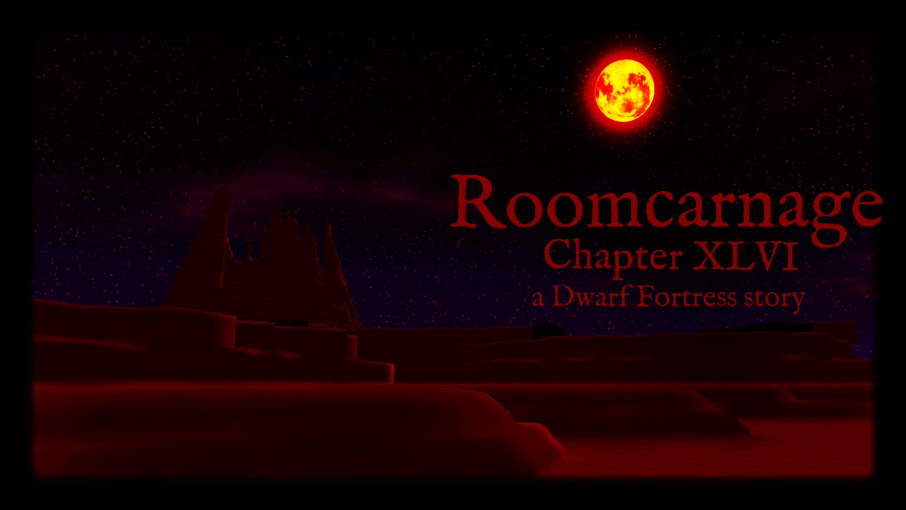 It is the 6th of Felsite, in the late spring of 1212. The crises of the early spring have been averted, and the fortress has returned to a quiet equilibrium of calm contentedness. Roomcarnage has endured the nightmarish curse of Rith Craftportent - in the face of total destruction, the dwarves of the Momentous Dye have been forced to purge the fortress of all corporeal undead. All passages to and from the fortress have been sealed with obsidian blocks, except for the trade depot which is protected by lever-controlled bridges, and the new trash dump in the barracks, set high into a cavern wall overlooking a magma lake. In short, Roomcarnage is safe - as safe as any fortress hewn from haunted stone can be - and the time has come for the dwarves to begin their final ascent towards glory.