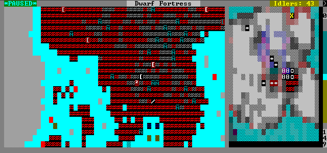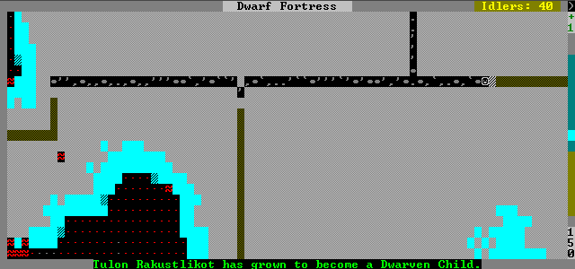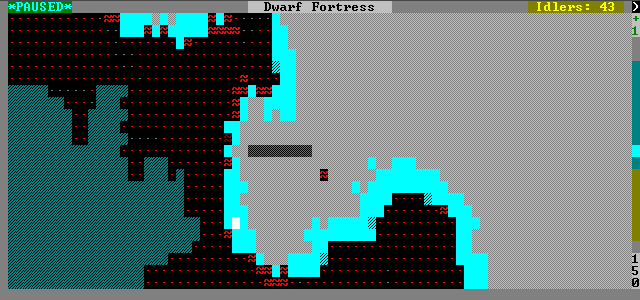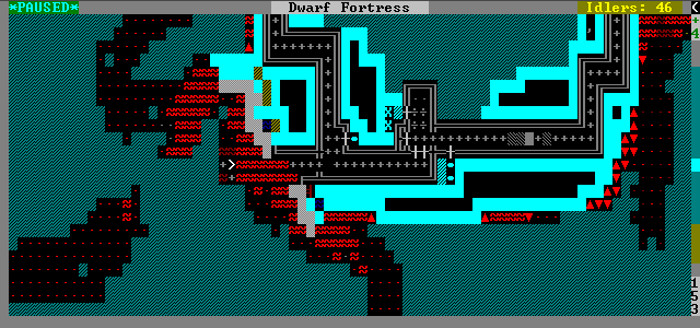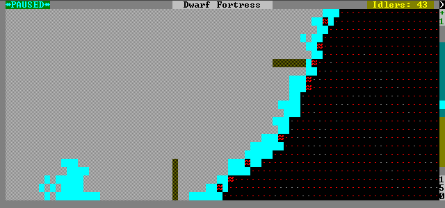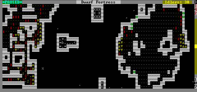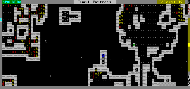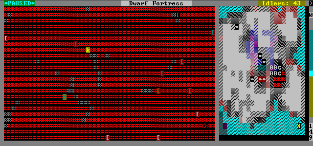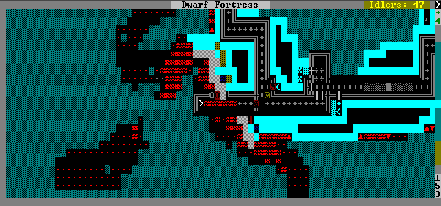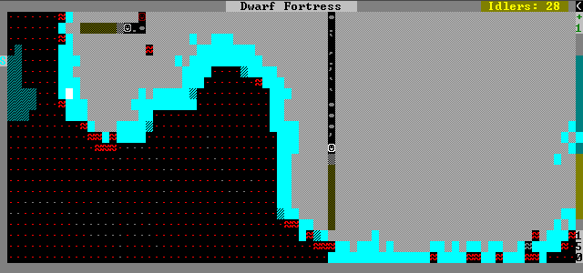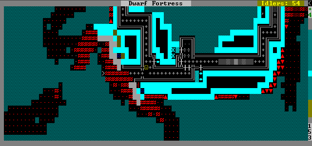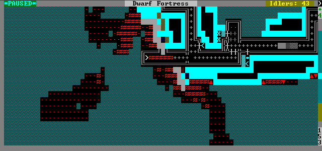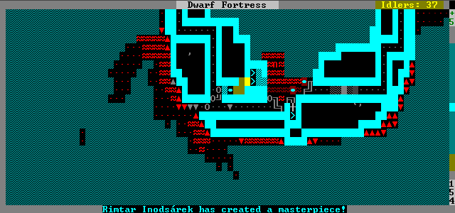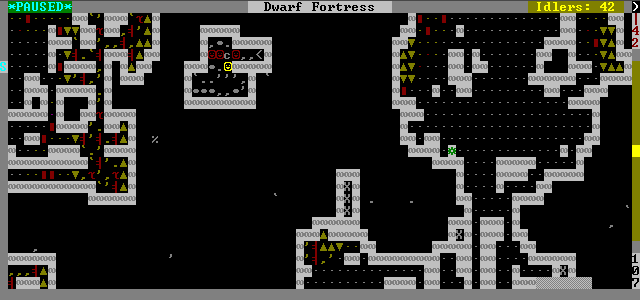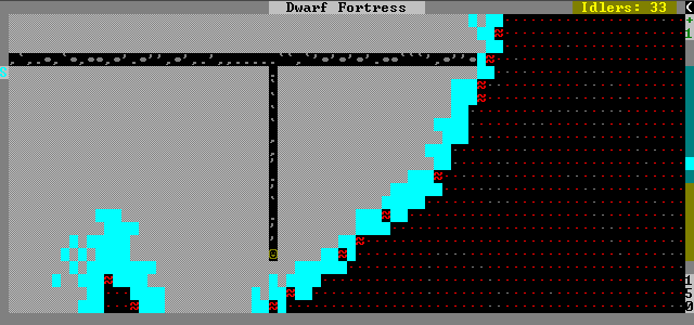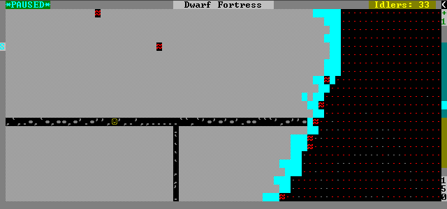 Because these tunnels are going to be very narrow - only one urist wide - it may take some time to mine out. That's alright, I can wait. Roomcarnage is safe for the time being - the dwarves are content, well fed, and drunk. With the surface and cavern floor walled off, nothing will be able to get in on foot. True, there are a few points above and below ground where a flying creature, by chance, might enter the fortress - but in Roomcarnage's eleven and a half years, not a single one ever has.