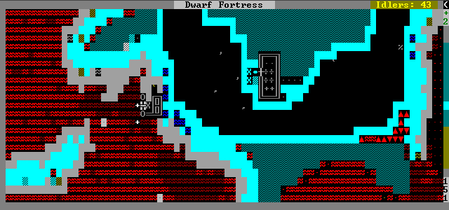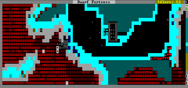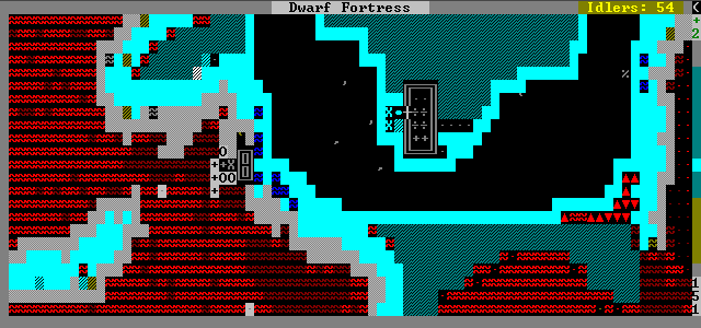 While the fortress' miners are excavating the lever room, I watch as the dwarves complete the walls above the plateau. As the obsidian bricks are carefully laid in place, I reflect on how this vent, wide-hewn and carefully lined with stone, was the first to erupt with molten rock. Now, the weapon's adamantine pumps will force a torrent of magma downward, into the lava pool below the surface of the plateau - which, very soon, will be connected to another series of pipes leading to various other places on the map.