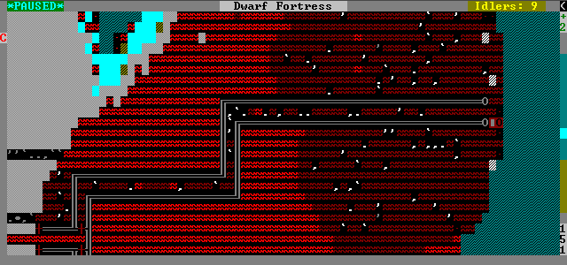 Without graphically displaying tile depth - an initialization option that I have decided not to take advantage of - I must use the cursor to examine the flow of lava. The puddle of lava is shallow, as is the lava in the easternmost portion of the tunnel - but one can plainly see the oncoming wave of molten rock coursing through the channel.
